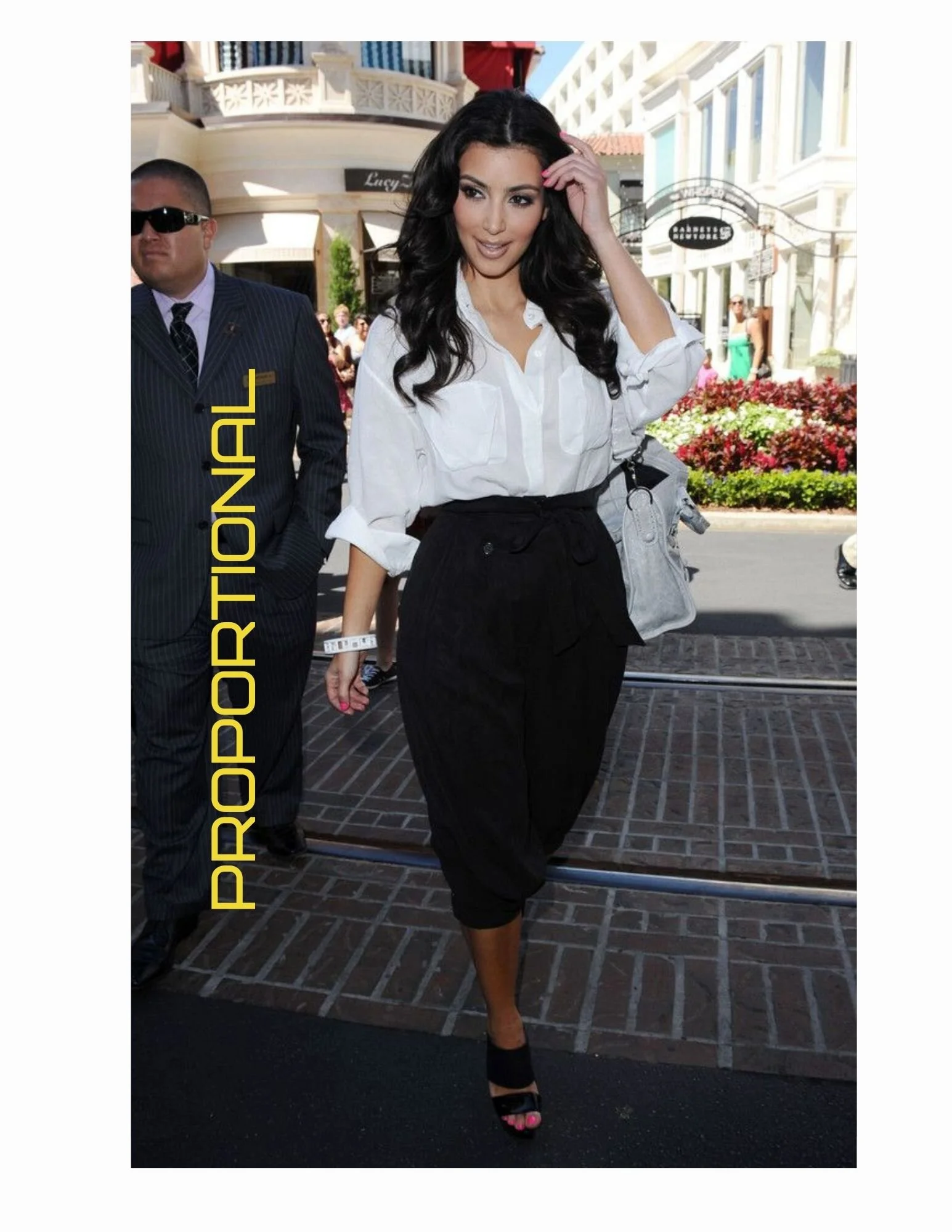 Any style pants that will accentuate and add volume to the bottom half are essential. Baggy trousers, combat, flares, and culotte are great examples. Pleats are a great design detail that naturally adds volume. Jean styles that flare from the knee are great such as bootleg, wide. Also boyfriend style, and baggy jeans to give the illusion of more shape on the bottom half.